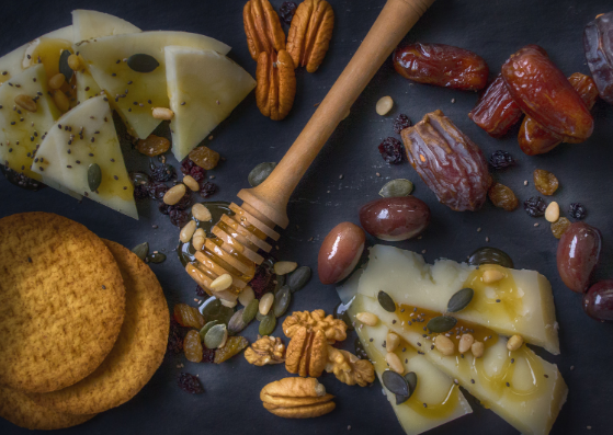 Nuts. High in protein, fibre and essential fats. Hazelnuts, almonds and chestnuts have low saturated fat content while cashews and Brazil nuts have a high saturated fat level.